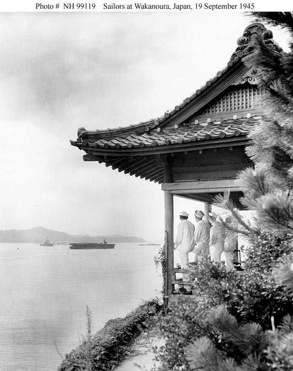 98k | Sailors sightseeing at Wakanoura Wan, Wakayama, Japan, 19 September 1945, a few weeks after the end of World War II. Ships in the left distance are (from left to left-center): USS Montpelier (CL-57); USS Sanctuary (AH-17) and USS Makin Island (CVE-93). Collection of Rear Admiral Calvin T. Durgin, USN, donated by his Daughter, Mrs. Phyllis Sherrill, 1972. Official U.S. Navy Photograph, from the collections of the Naval Historical Center (# NH 99119). (See also photo NS0309331.) |