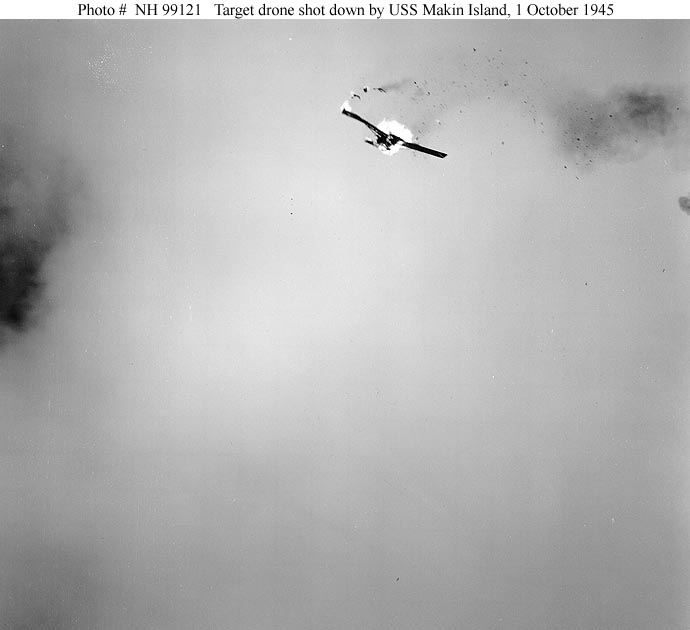 34k | Small Target Drone Aircraft falling in flames, after being shot down by USS Makin Island (CVE-93) during gunnery practice off Wakanoura Wan, Wakayama, Japan, 1 October 1945. Collection of Rear Admiral Calvin T. Durgin, USN, donated by his Daughter, Mrs. Phyllis Sherrill, 1972. Official U.S. Navy Photograph, from the collections of the Naval Historical Center (# NH 99121). |