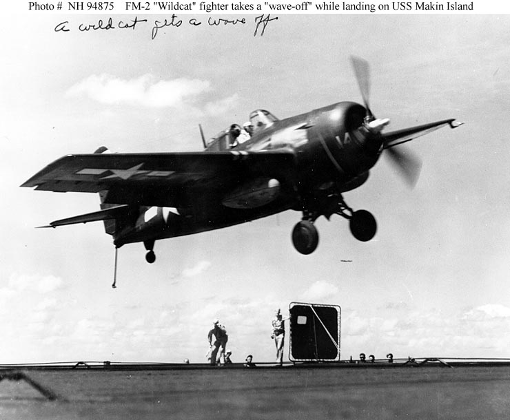 61k | General Motors FM-2 Wildcat fighter gets a "wave-off" from the Landing Signal Officer, while attempting to land on USS Makin Island (CVE-93), circa 1944-45. Courtesy of PHC John Highfill, USN (Retired). U.S. Naval Historical Center Photograph (# NH 94875). |