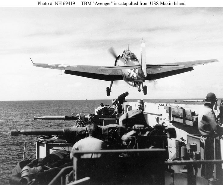 78k | TBM Avenger torpedo plane is catapulted from USS Makin Island (CVE-93), circa 1945. Collection of Vice Admiral Calvin T. Durgin. Donated by his daughter, Mrs. Phyllis Durgin Sherrill, 1969. Official U.S. Navy Photograph, from the collections of the Naval Historical Center (# NH 69419). |