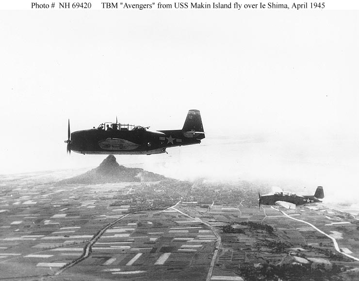 57k | TBM Avenger torpedo planes, of Composite Squadron 84 (VC-84) fly over Ie Shima, Ryukyu Islands, on 16 April 1945. View looks east. The planes were based on board USS Makin Island (CVE-93). Collection of Vice Admiral Calvin T. Durgin. Donated by his daughter, Mrs. Phyllis Durgin Sherrill, 1969. Official U.S. Navy Photograph, from the collections of the Naval Historical Center (# NH 69420). |