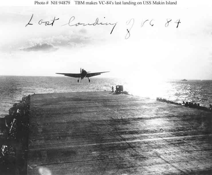 73k | A TBM-1 Avenger torpedo bomber makes Composite Squadron 84's (VC-84) last landing on board, circa mid-1945. Courtesy of PHC John Highfill, USN (Retired). U.S. Naval Historical Center Photograph (# NH 94879). |