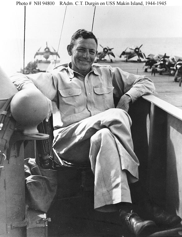 78k | Rear Admiral Calvin T. Durgin, USN, on the bridge of his flagship, USS Makin Island (CVE-93), circa 1944-1945. The original print carried an inscription by RAdm. Durgin to the donor, who was the ship's Photographic Officer. Courtesy of PHC John Highfill, USN (Retired). U.S. Naval Historical Center Photograph (# NH 94800). |