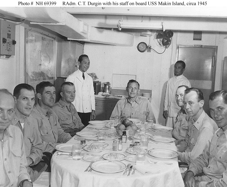 94k | Rear Admiral Calvin T. Durgin, USN, with members of his staff, in their Wardroom on board USS Makin Island (CVE-93), circa 1945. Present are (seated from left to right): Lieutenant Commander Price Gilbert, Jr., USNR; Lieutenant Commander Sherlock Hibbs., USNR; Lieutenant Commander Daniel Cone; Captain Joseph L. Kane, USN; Rear Admiral Durgin; Commander Milton A. Nation, USN; Commander Irvin L. Dew, USN; and Lieutenant Commander Thomas S. Gates, Jr., USNR. Collection of Vice Admiral Calvin T. Durgin. Donated by his daughter, Mrs. Phyllis Durgin Sherrill, 1969. Official U.S. Navy Photograph, from the collections of the Naval Historical Center (# NH 69399). |
