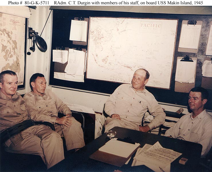 97k | Rear Admiral Calvin T. Durgin, USN, Commander of an escort carrier task group, with senior members of his staff in the ACI room of USS Makin Island (CVE-93), during the Okinawa campaign, circa May 1945. Those present are, from left to right: Captain Joseph L. Kane; Rear Admiral Durgin; Captain William B. Whaley; and Captain Victor Long. Official U.S. Navy Photograph, now in the collections of the National Archives (# 80-G-K-5711). |