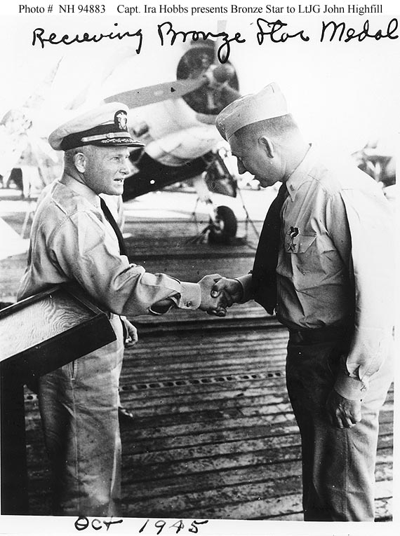 97k | Lieutenant (Junior Grade) John L. Highfill (right), the ship's Photographic Officer, receives the Bronze Star from Captain Ira E. Hobbs, Commanding Officer, in October 1945. Courtesy of PHC John Highfill, USN (Retired). U.S. Naval Historical Center Photograph (# NH 94883). |