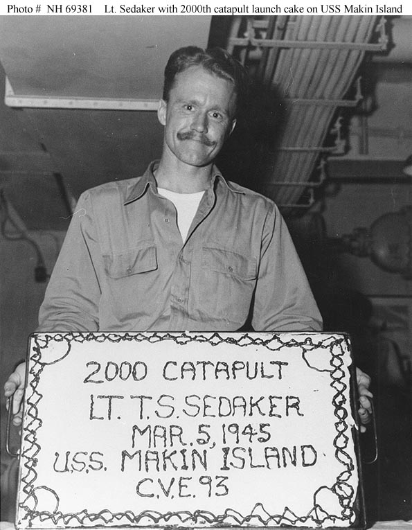 94k | Lieutenant Thomas B. Sedaker, USN, displays the cake baked in celebration of the 2,000th catapult launch of an aircraft by USS Makin Island (CVE-93), 5 March 1945. Collection of Vice Admiral Calvin T. Durgin. Donated by his daughter, Mrs. Phyllis Durgin Sherrill, 1969. Official U.S. Navy Photograph, from the collections of the Naval History & Heritage Command (NH&HC), # NH 69381. |