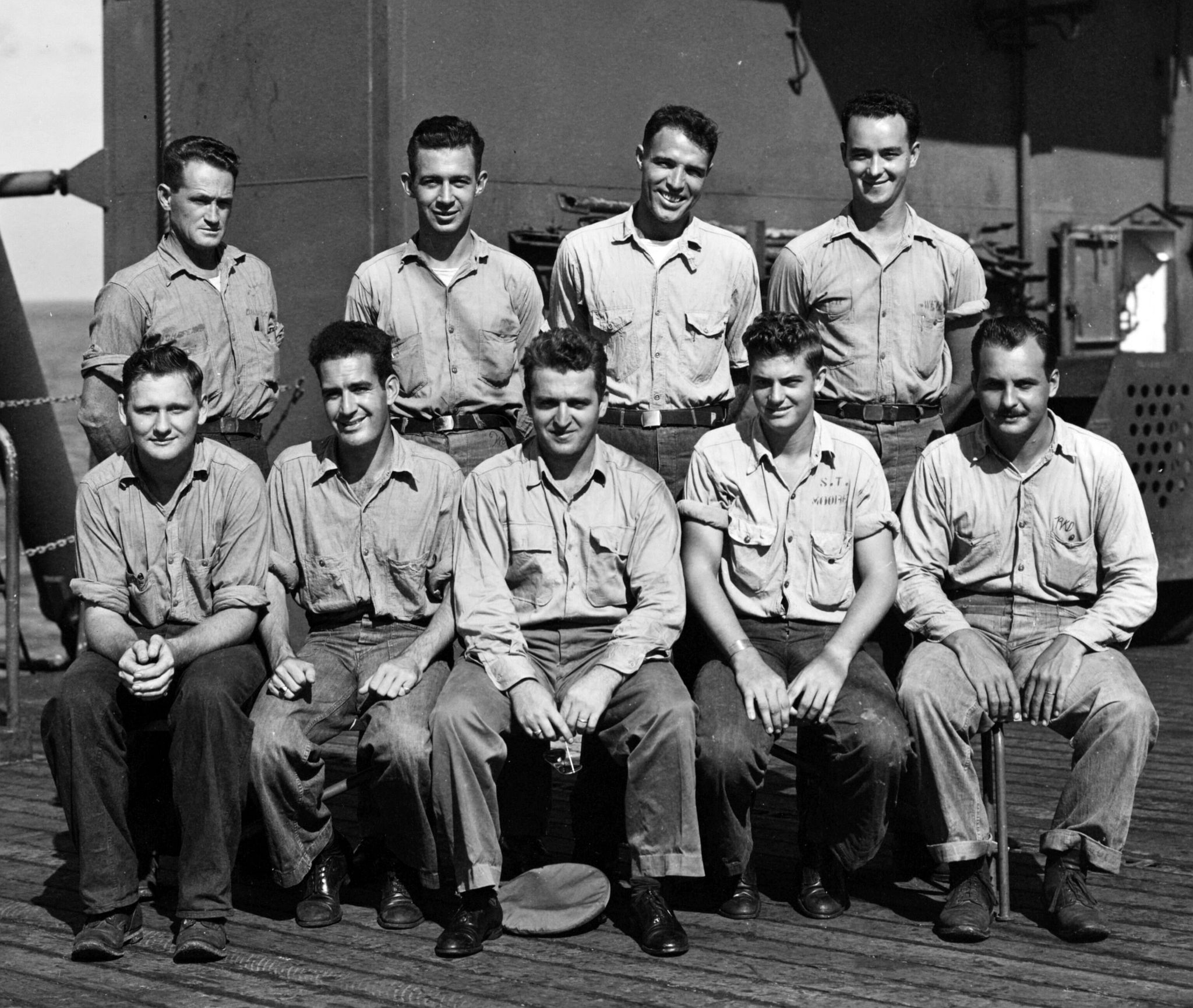 528k | Ship's Yeomen pose on the flight deck, circa 1945. Present are: Seated, left to right: Y3c M.R. Gelster; Y1c J.R. Shaw; Chief Yeoman J.J. Formichella; Y3c S.T. Moore; and Y2c R.K. Duncan. Standing, left to right: Y3c D.H. Speake; Y1c R.B. Worrall; Y1c J.M. Harvey; and Y3c W.E. Rabe. Collection of Vice Admiral Calvin T. Durgin. Donated by his daughter, Mrs. Phyllis Durgin Sherrill, 1969. Official U.S. Navy Photograph, from the collections of the Naval History & Heritage Command (NH&HC), # NH 69397. |