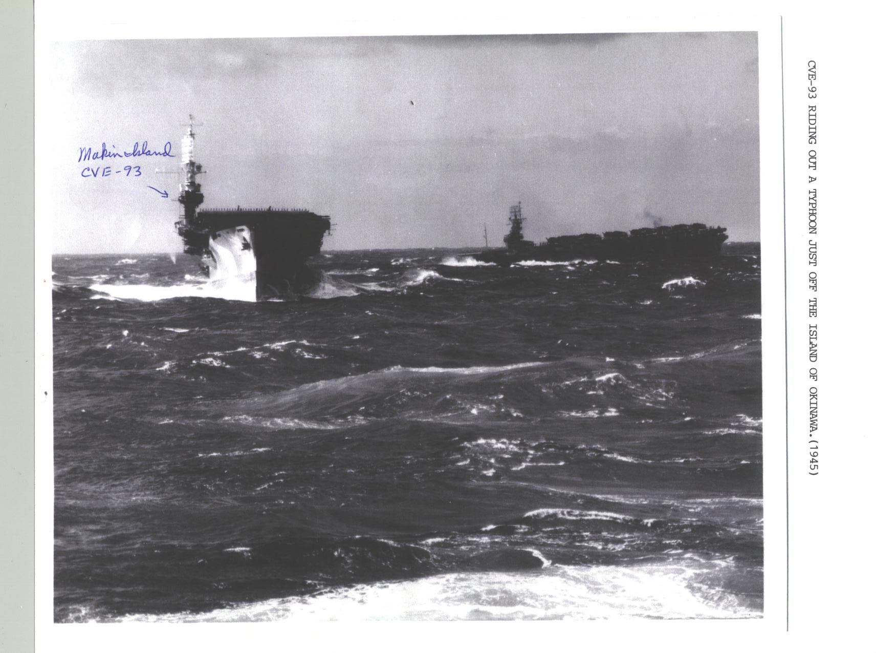 190k | USS Makin Island (CVE-93) riding out a typhoon just off the island of Okinawa, July 1945. Collection of LT J.W. Glock, who served as LSO aboard Makin Island, 1944–1945. |