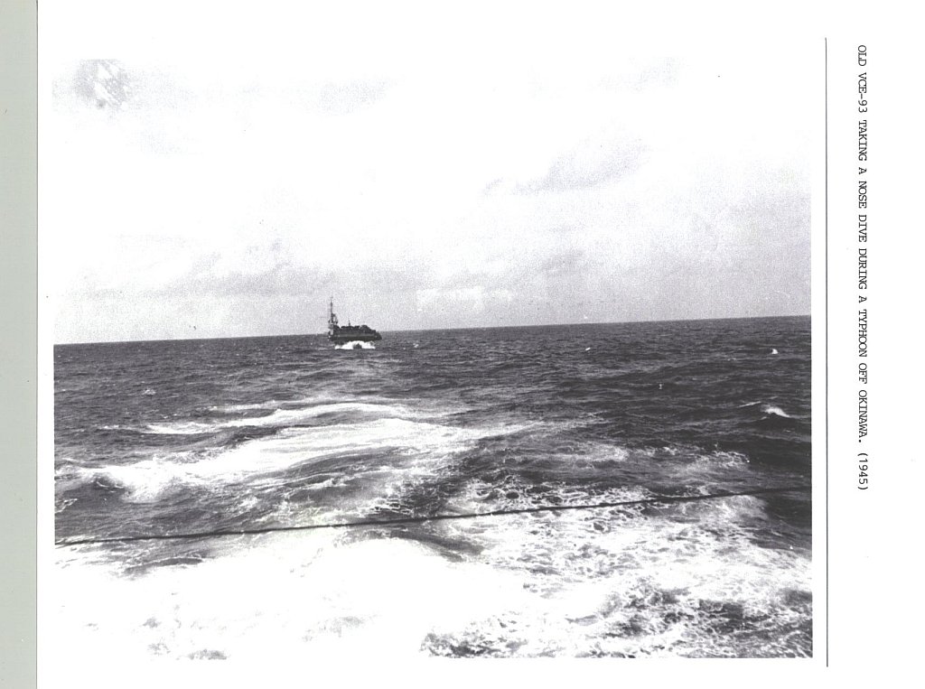 114k | USS Makin Island (CVE-93) taking a nose dive during a typhoon off Okinawa, July 1945. Collection of LT J.W. Glock, who served as LSO aboard Makin Island, 1944–1945. |