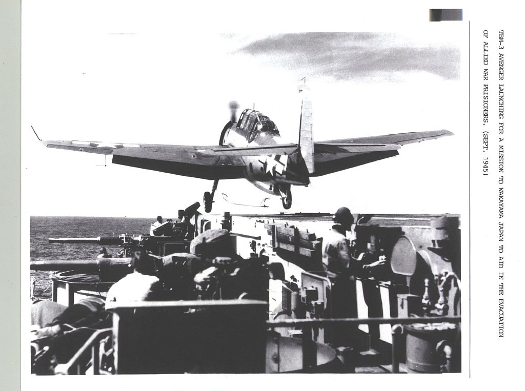 103k | TBM-3 Avenger launching for a mission to Wakayama, Japan to aid in the evacuation of allied war prisoners, September 1945. Collection of LT J.W. Glock, who served as LSO aboard Makin Island, 1944–1945. |