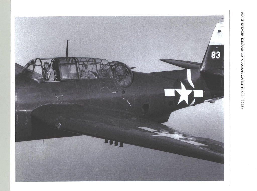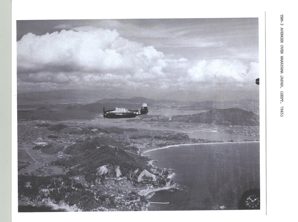 121k | TBM-3 Avenger of Composite Squadron 41 (VC-41) over Wakayama, Japan September 1945. Collection of LT J.W. Glock, who served as LSO aboard Makin Island, 1944–1945. |