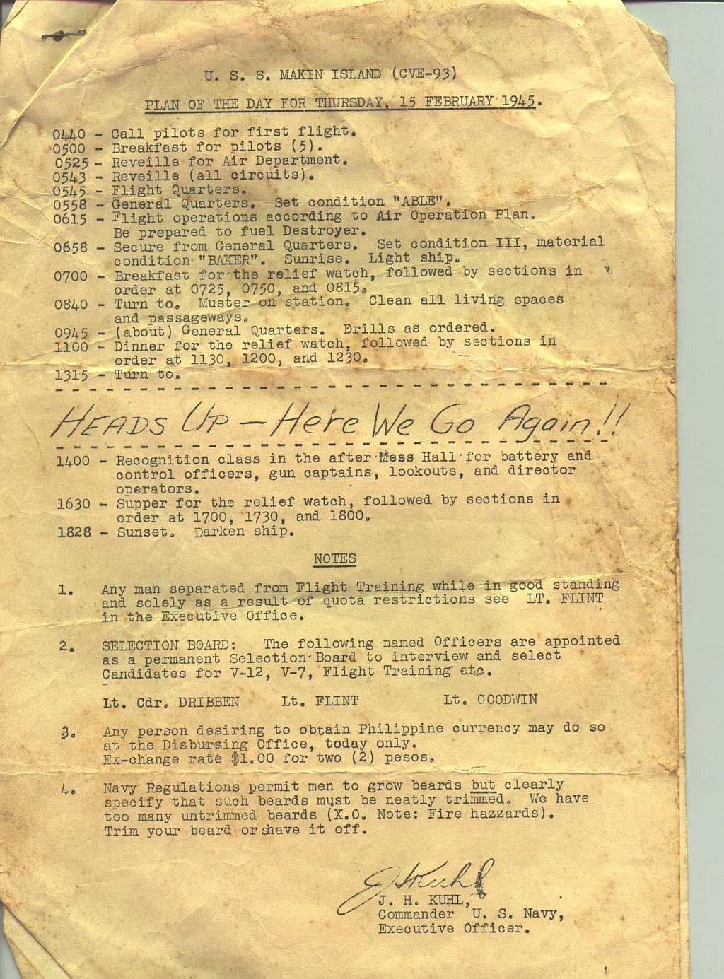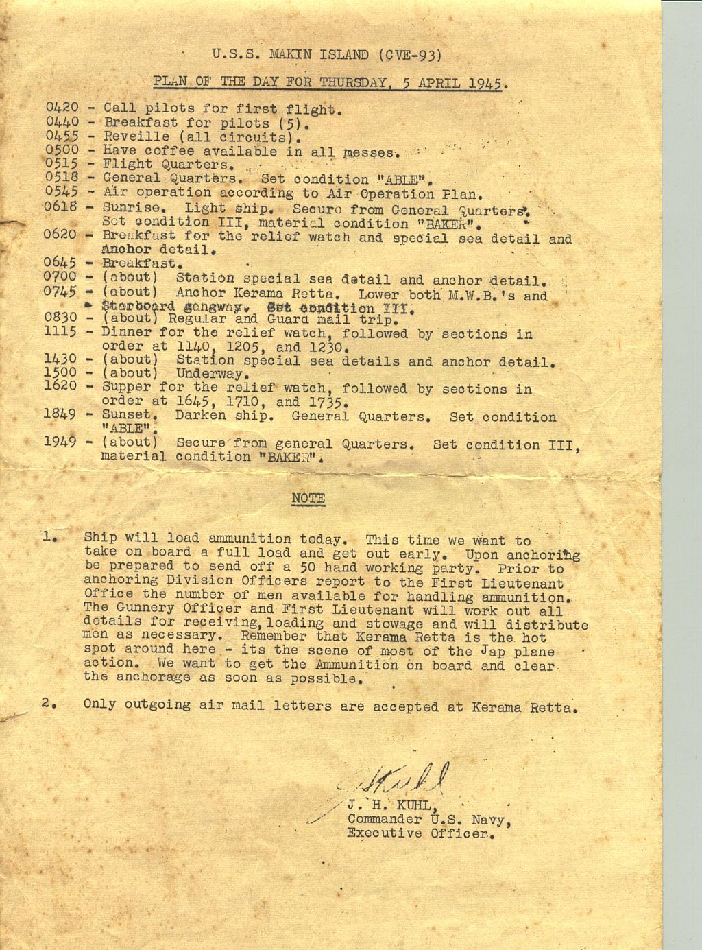 396k | Plan of the Day, April 5, 1945. Collection of LT J.W. Glock, who served as LSO aboard Makin Island, 1944–1945. |
