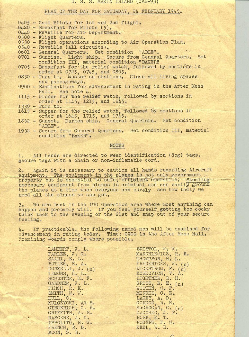 405k | Plan of the Day, February 24, 1945. Collection of LT J.W. Glock, who served as LSO aboard Makin Island, 1944–1945. |