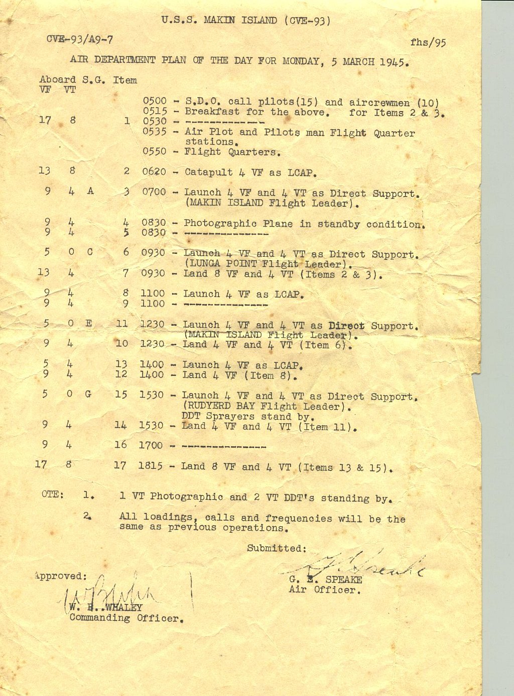 321k | Plan of the Day, March 5, 1945. Collection of LT J.W. Glock, who served as LSO aboard Makin Island, 1944–1945. |