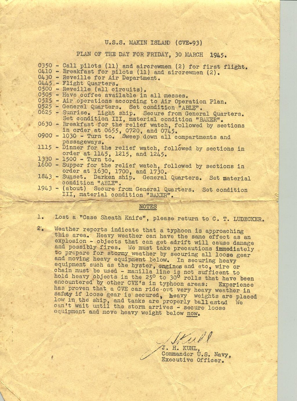 386k | Plan of the Day, March 30, 1945. Collection of LT J.W. Glock, who served as LSO aboard Makin Island, 1944–1945. |