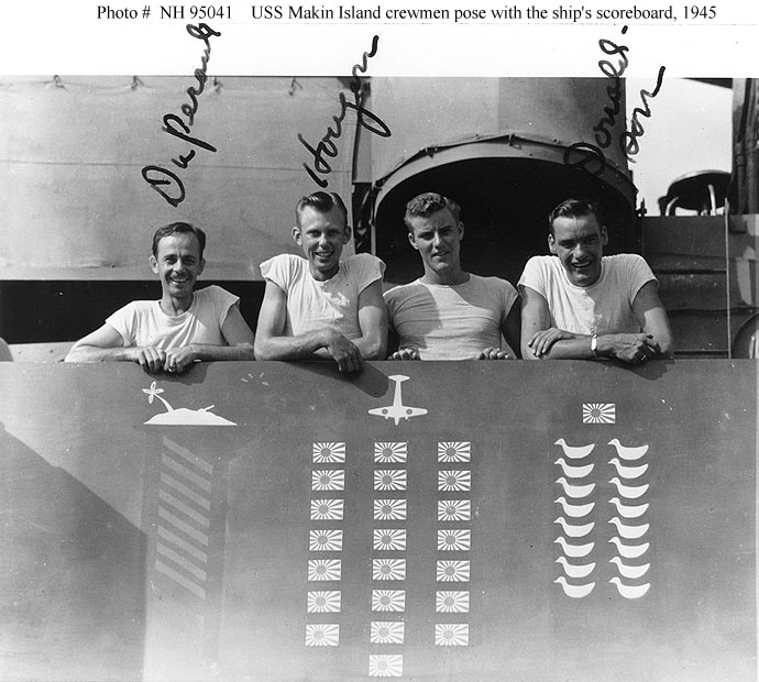 86k | Crewmen pose with the ship's scoreboard of enemy "kills" painted on the bridge wing, 1945. Three of these men are identified as: DuPeraul, Hougon and Donaldson. Courtesy of PHC John L. Highfill, USN (Retired). U.S. Naval History & Heritage Center Photograph. (# NH 95041). |