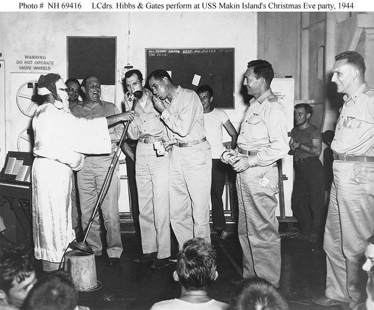 99k | Lieutenant Commander Sherlock Hibbs, USNR (behind Santa's microphone) and Lieutenant Commander Thomas S. Gates, Jr., USNR (to right of microphone) make merry with toy musical instruments during a Christmas Eve party on board USS Makin Island (CVE-93), 24 December 1944, while the ship was at Manus, Admiralty Islands. Looking on, second from right, is Rear Admiral Calvin T. Durgin, USN. Collection of Vice Admiral Calvin T. Durgin. Donated by his daughter, Mrs. Phyllis Durgin Sherrill, 1969. Official U.S. Navy photograph, from the collections of the Naval History & Heritage Command (# NH 69416). |