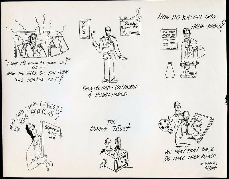 93k | "Original WWII U.S. Navy Trench Art Cartoon Photo—signed R. Woock and Hunt." "Many of the large ships had photo-developing rooms, that were part of the on-board print shop. Also, most bases had photo-developing rooms attached to the base print shops. The men who worked these shops often used the facilities to create what can best be described as 'Trench Art.' Here, a photo was created using enlisted men's faces that were attached to the bodies of cartoon figures to create these humorous cartoons." "This came from the collection of a WWII serviceman who served with the U.S. Navy Composite Squadron (VC) 41. It most likely was created aboard USS Makin Island (CVE-93) or at one of the mainland bases that were part of the VC-41 squadron's training." |