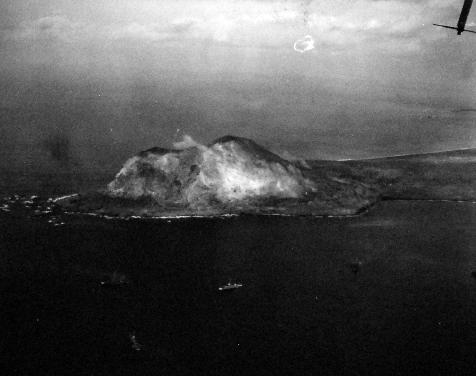 299k | Battle for Iwo Jima, February–March 1945. Shown: Mt. Suribachi on Iwo Jima with smoke rising from the beach due to dive bombing. Photographed by plane from USS Makin Island (CVE-93) on D-Day, 19 February 1945. U.S. Navy photograph, now in the collections of the National Archives and Records Administration (NARA), # 80-G-304971. |