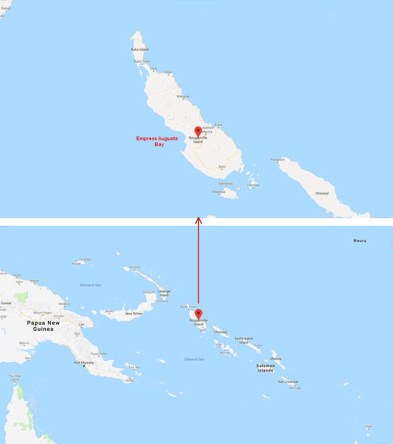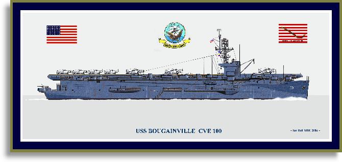 64k | CVE-100 was initially named Didrickson Bay for a bay (also known as Deep Bay) on the west coast of Chichagof Island, Alexander Archipelago, Alaska (NS0306409). Renamed Bougainville, 26 April 1944, to commemorate a major campaign fought on the island by that name, in the northern Solomons (NS0310003). Allied troops stormed ashore at Cape Torokina on 1 November 1943. During the early morning hours of the 2nd, a Japanese surface force composed of four cruisers and six destroyers tried unsuccessfully to break up the invasion in what became known as the Battle of Empress Augusta Bay: