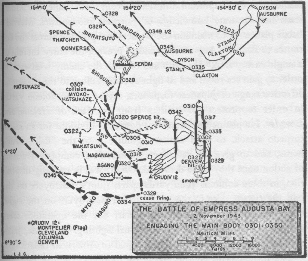Since the purpose of the assault was to secure air bases to isolate the large Japanese base at Rabaul, New Britain, and not necessarily to occupy the entire island, enemy land forces remained active on Bougainville through the end of the war. NS0310003a: Chart, "The Battle of Empress Augusta Bay." (See also (Maps NS0306409 and NS0310003 courtesy of Google Maps. Chart NS0310003a courtesy of The Two-Ocean War, by Samuel Eliot Morison [Galahad Books, 1997].) |