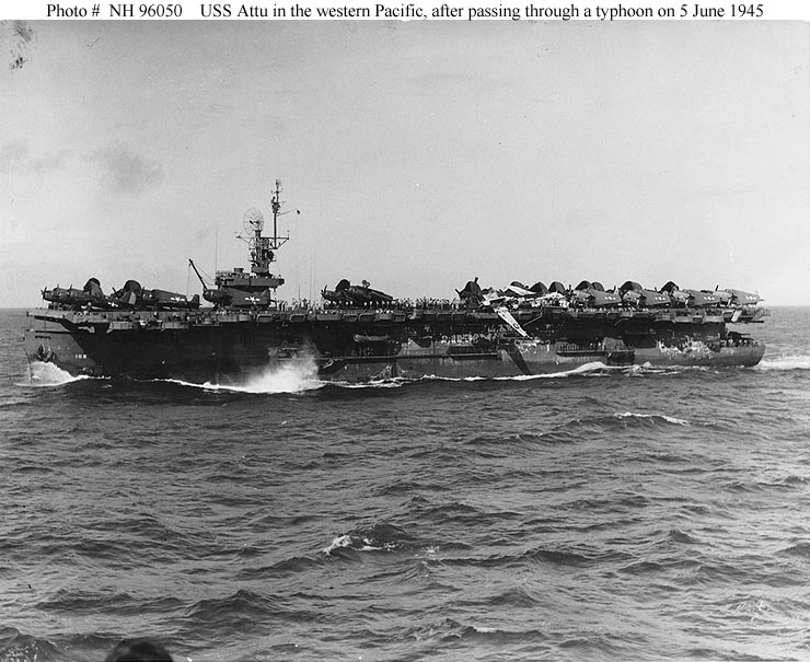 101k | USS Attu (CVE-102) underway in the western Pacific, after passing through a typhoon on the morning of 5 June 1945. Note the upended airplanes on her deck, including at least three TBMs. Collection of Captain Hays R. Browning, USNR. Naval History and Heritage Command photo (#NH 96050) |