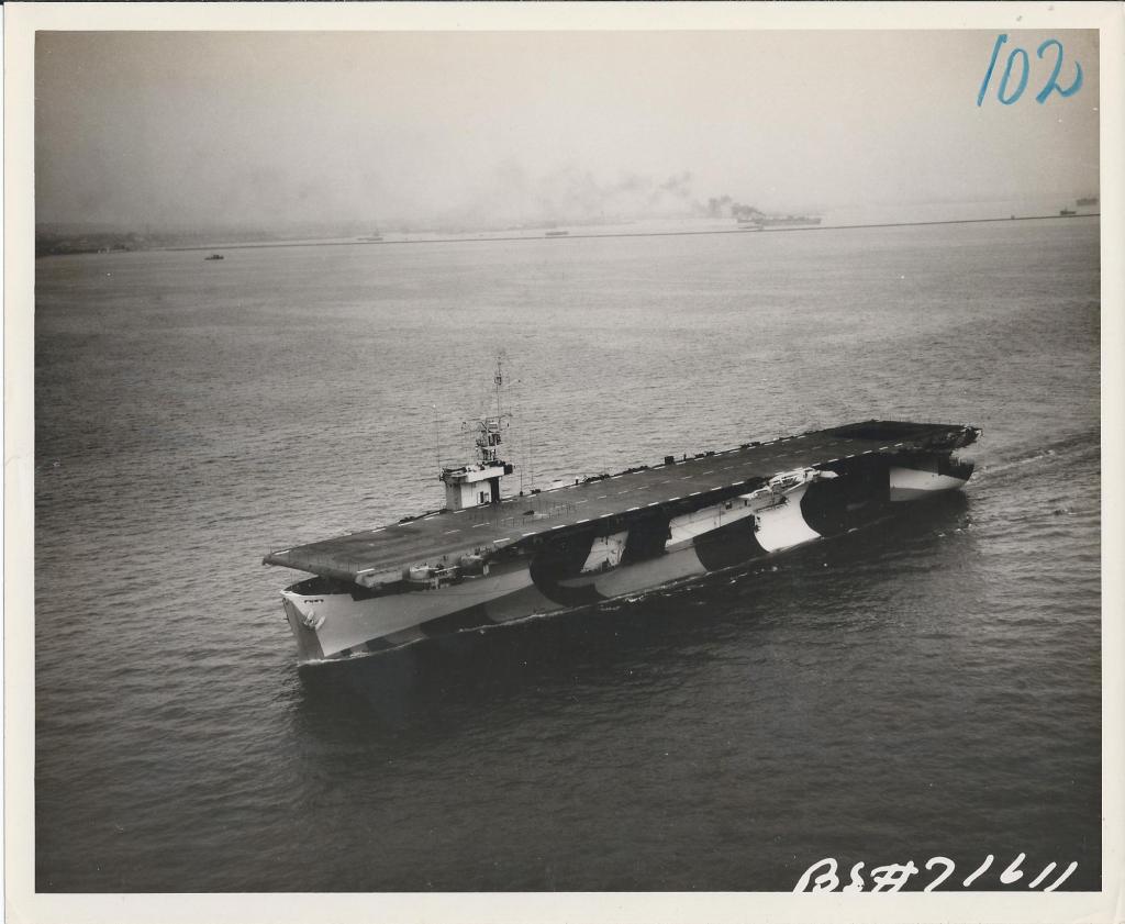 239k | Aerial view of USS Attu (CVE-102) underway off California, 28 September 1944. Note contrast of the various colors of the camouflage pattern. USN photo. |