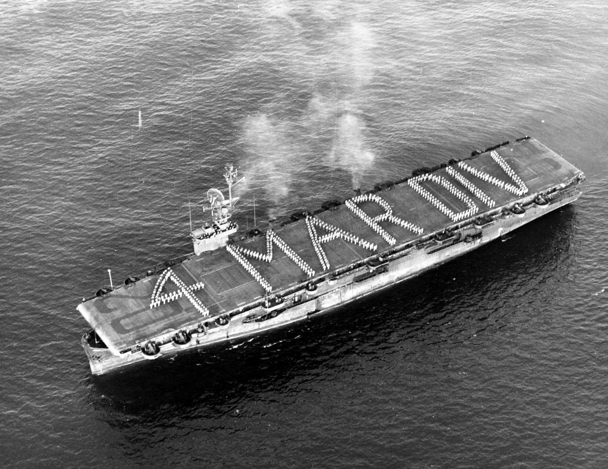352k | USS Attu (CVE-102) arrives at San Diego, California, at the end of a "magic carpet" transport run, on 12 October 1945. Personnel on deck are paraded in honor of the Fourth Marine Division. Photo by NAS San Diego. Collection of Captain Nays R. Browning, USNR. Naval History and Heritage Command (NHHC), photo # NH 96048. |