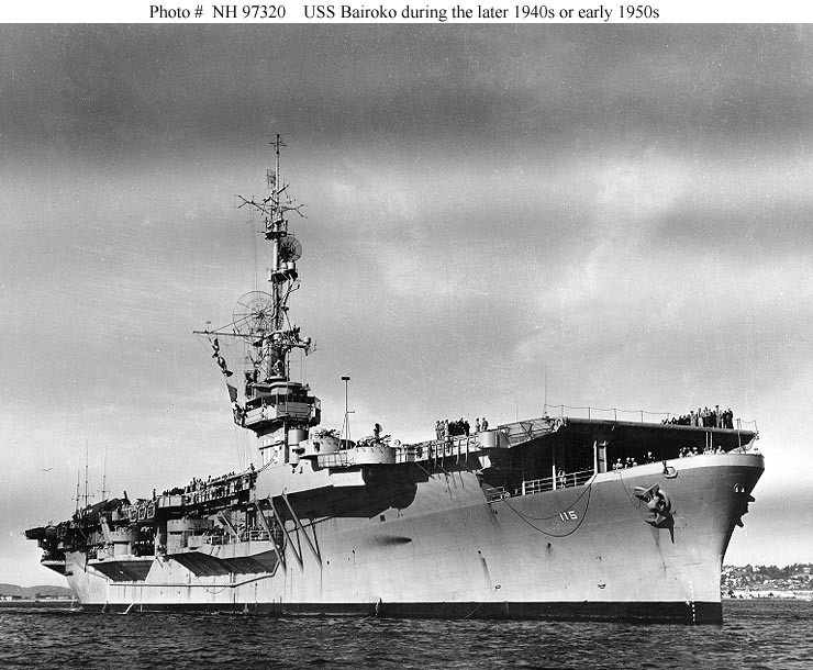 125k | USS Bairoko (CVE-115) photographed during the later 1940s or early 1950s, off San Diego, California. This photograph was received by the Naval Photographic Center in December 1959, many years after it was taken. Official U.S. Navy Photograph, from the collections of the Naval Historical Center (# NH 97320). |