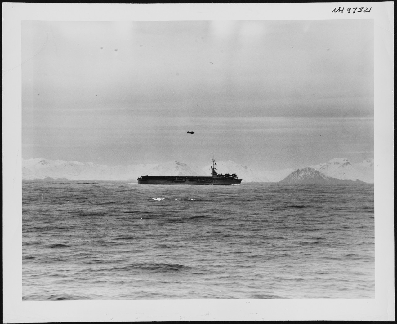 216k | "Escort Carrier, the USS Bairoko, (CVE-115), part of the Air Support Group under the command of Rear Admiral M.R. Greer, USN, steams past snow covered mountains of Kodiak while recovering Marine support aircraft during 'Operation MICOWEX'". Quoted from the original picture caption. This view was taken by a USS Boxer (CV-21) photographer on 10 February 1949. A U.S. Marine Corps F4U aircraft is flying over the carrier and other F4Us are parked on her flight deck, forward. Kodiak Island is in the background. Official U.S. Navy Photograph, from the collections of the Naval History and Heritage Command (NH&HC), photo # NH 97321. |