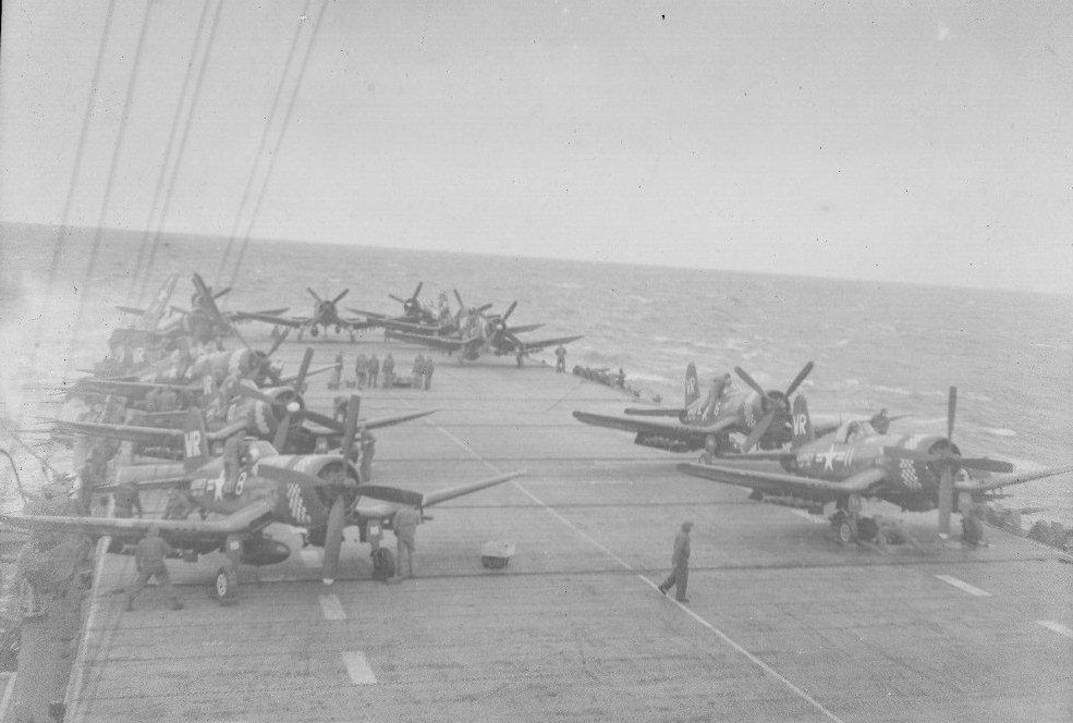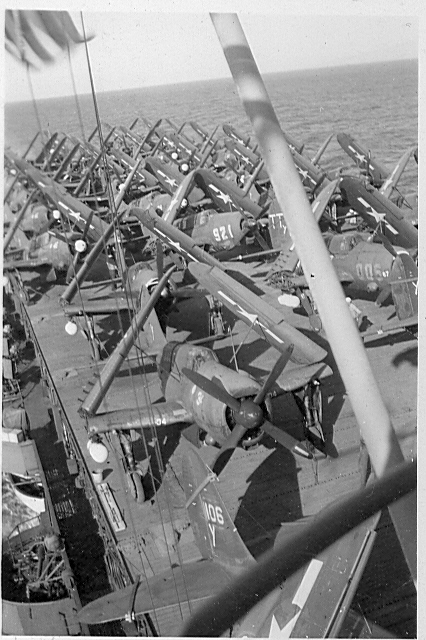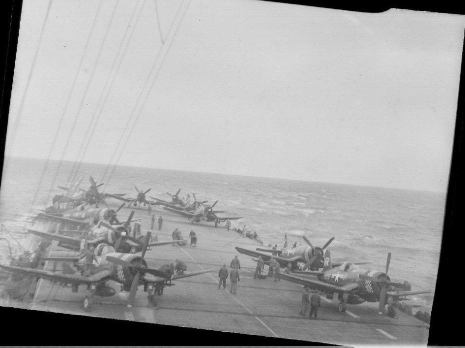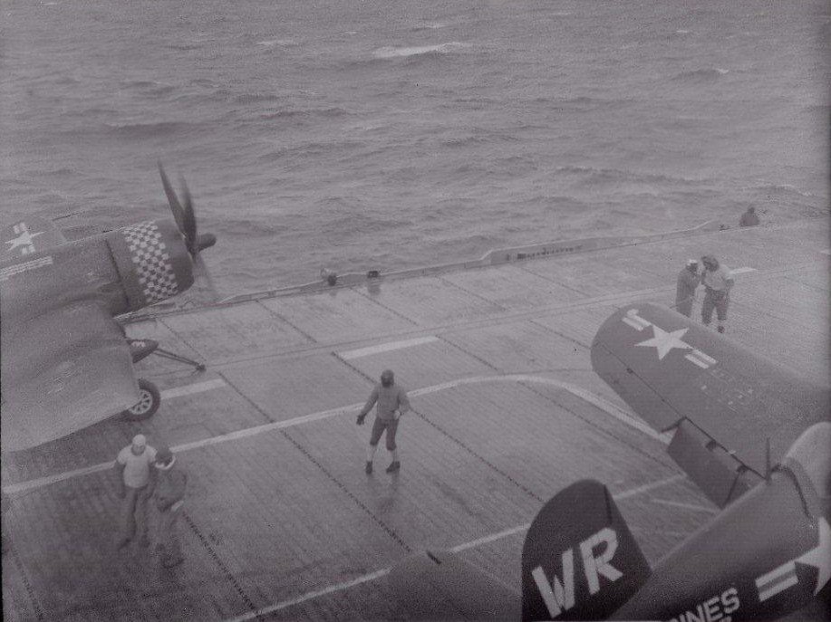 111k | Photos from the collection of Frank J. White, USS Bairoko (CVE-115), 1944–1945. F4U Corsairs on deck. |