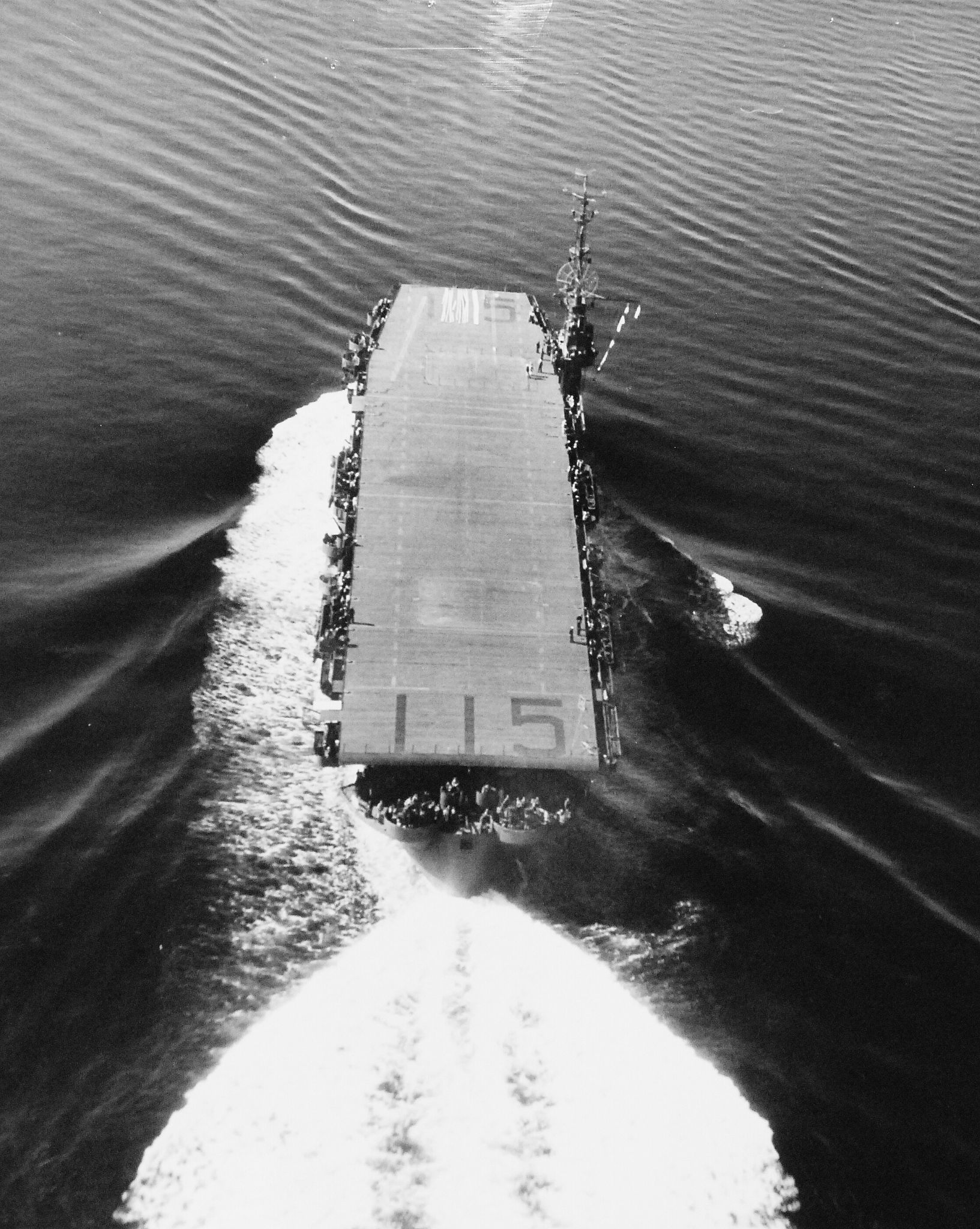 535k | Aerials of USS Bairoko (CVE-115), shown off Vashon Island, Washington, at an altitude of 400 feet and a speed of 20 knots. Photographed by aircraft from Naval Air Station, Seattle, Washington, 26 July 1945. NS0311509a: National Archives and Records Administration (NARA) photo, # 80-G-346690. NS0311509b: National Archives and Records Administration (NARA) photo, # 80-G-346692. |