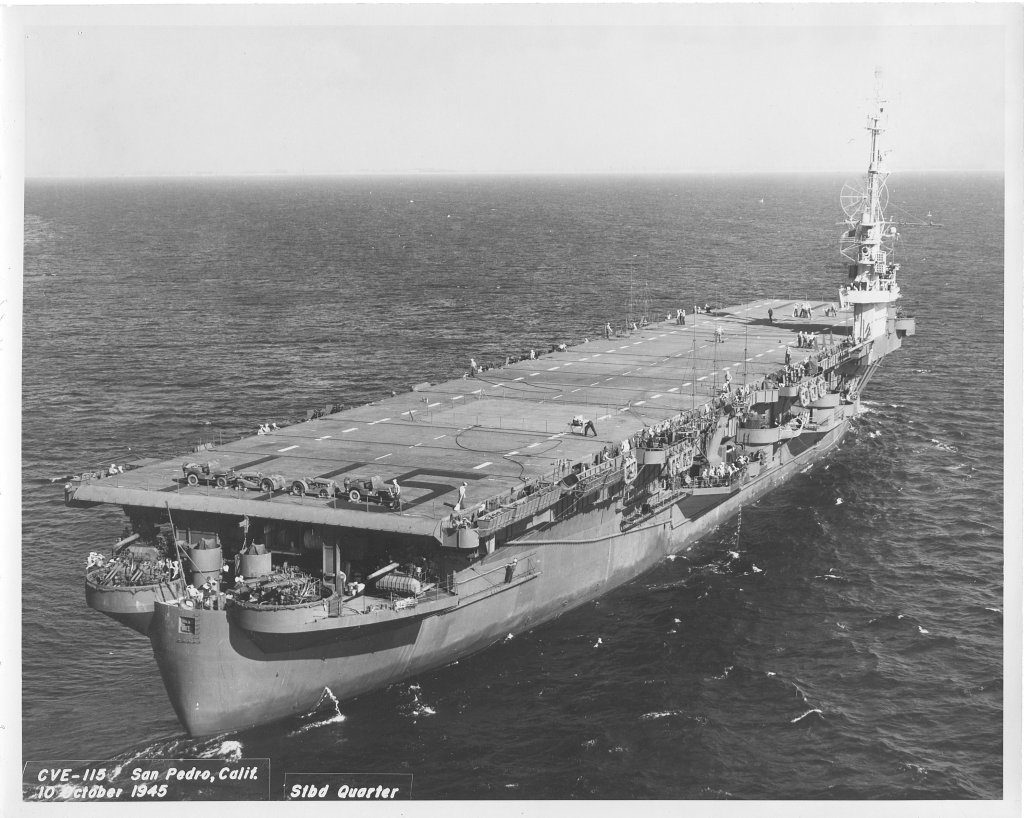 160k | Starboard quarter view of USS Bairoko (CVE-115), steaming off San Pedro, California, 10 October 1945. BuAer photo (# SP10461). |