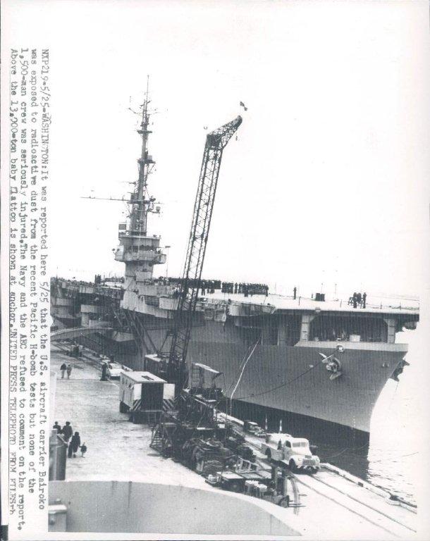 66k | "WASHINGTON: It was reported here 5/25[, 1948,] that the U.S. aircraft carrier Bairoko was exposed to radioactive dust from the recent Pacific H-bomb tests but none of the 1,500-man crew was seriously injured. The Navy and the AEC refused to comment on the report. Above the 13,000-ton baby flattop is shown at anchor. UNITED PRESS TELEPHOTO FROM FILES." |