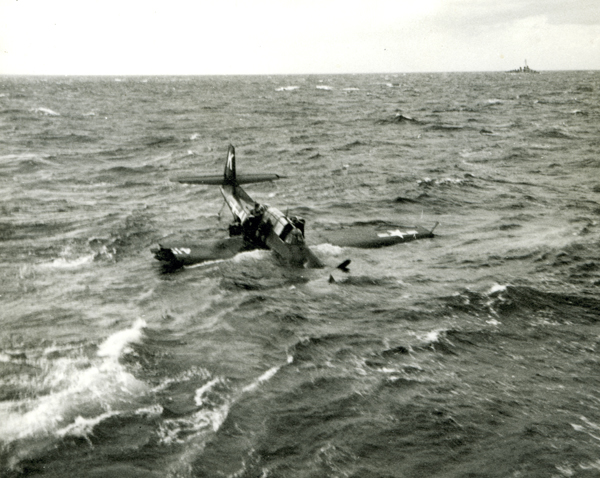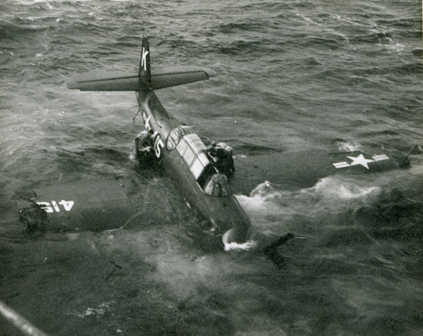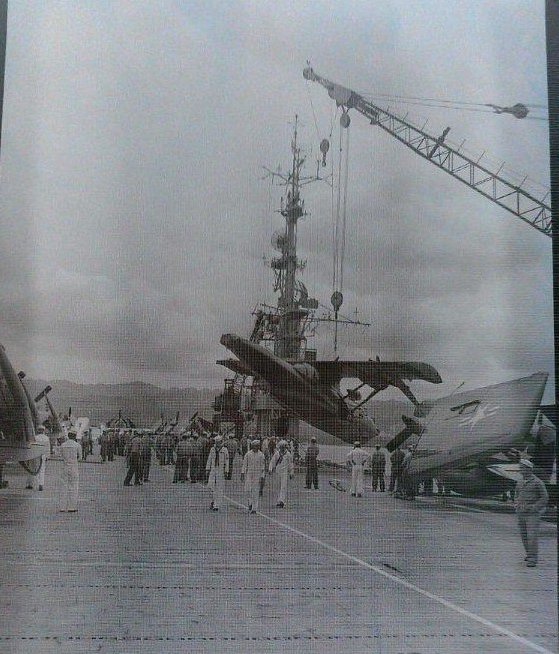 206k | "My father, John Owens, served aboard the Bairoko during Operation Miki in 1949 off the coast of Hawaii. During a landing approach, his Avenger [SK]415[, Composite Squadron (VC) 25,] was hit by a crosswind, swerved to port, clipping the right wing on the catwalk and plunged into the ocean. The pilot easily got out, but my dad who had climbed out of the turret realized that the crewman inside was trapped and couldn't open the hatch. He crawled over the fuselage and freed the crewman. Afterwards they drifted to the destroyer USS Brinkley Bass to be their guests until the operation was over. Luckily, the entire event was photographed." "The Avenger now on display at the USS Midway museum has the exact markings of my dad's old plane in tribute to the plane and its crew." |