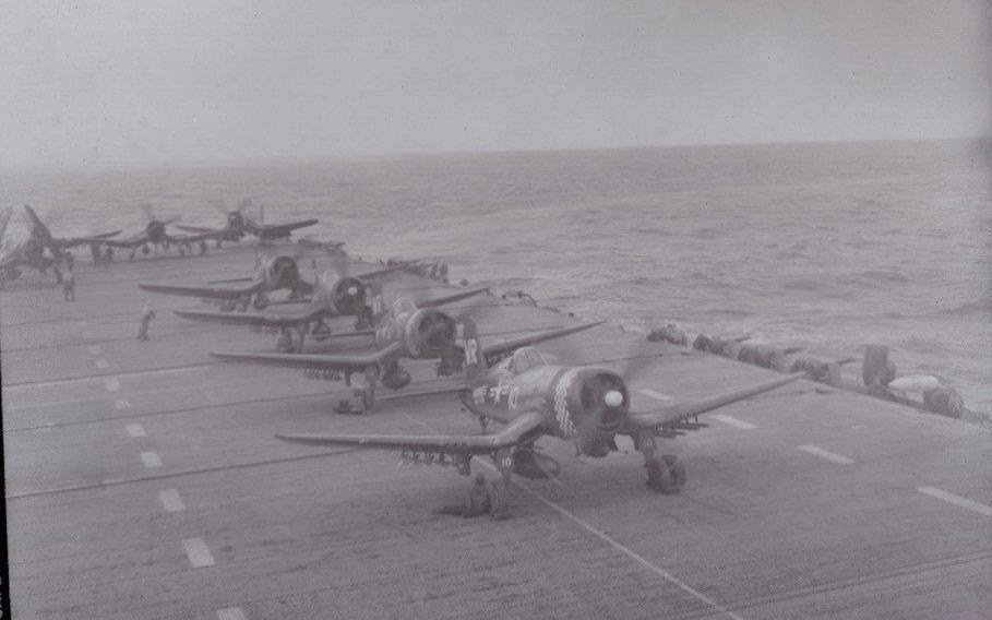 106k | US Marine Corps F4U-4 Corsairs from Marine Attack Squadron (VMA) 312 "Checkerboards" operating aboard USS Bairoko (CVE-115), probably off Korea, 1952–1953. |