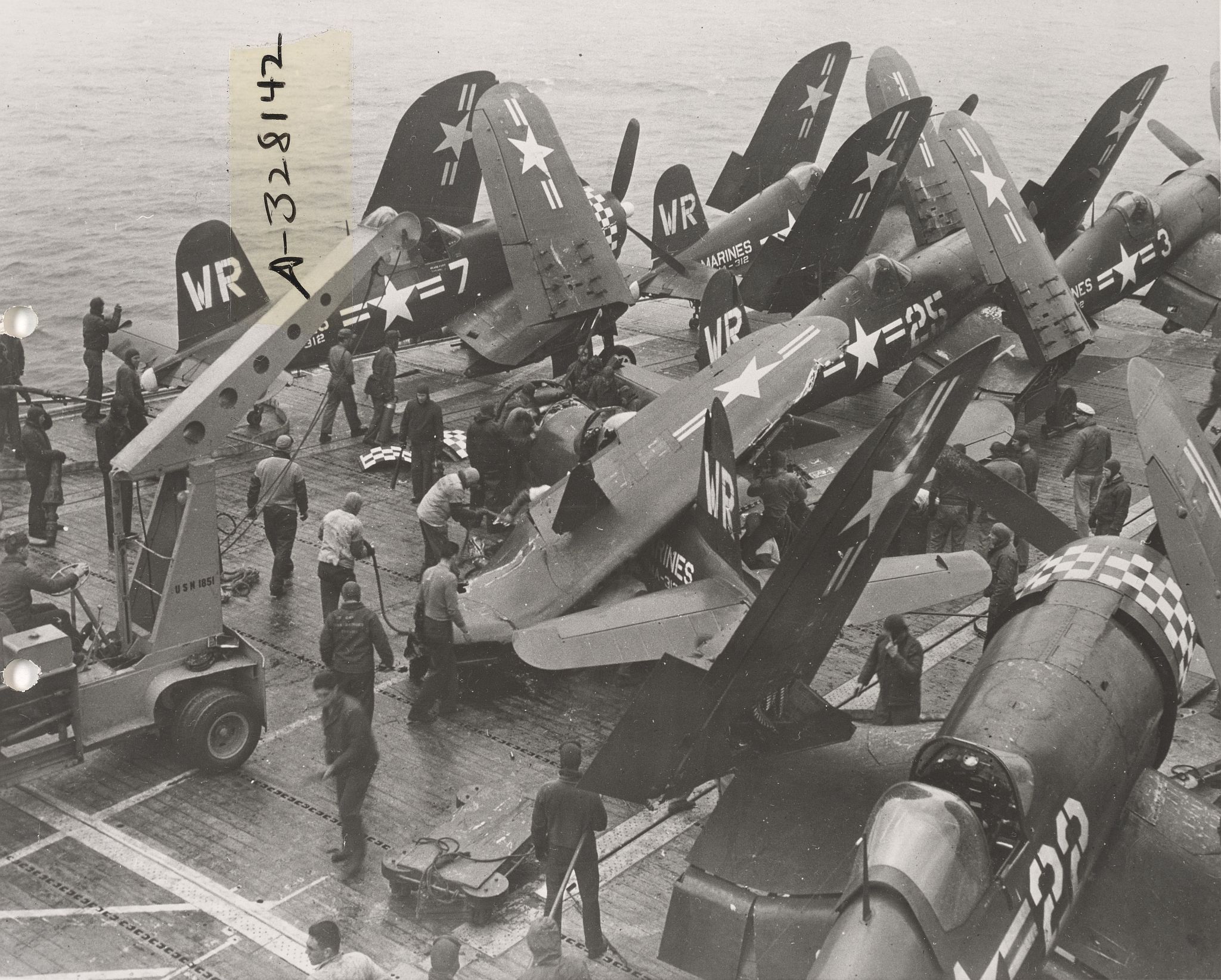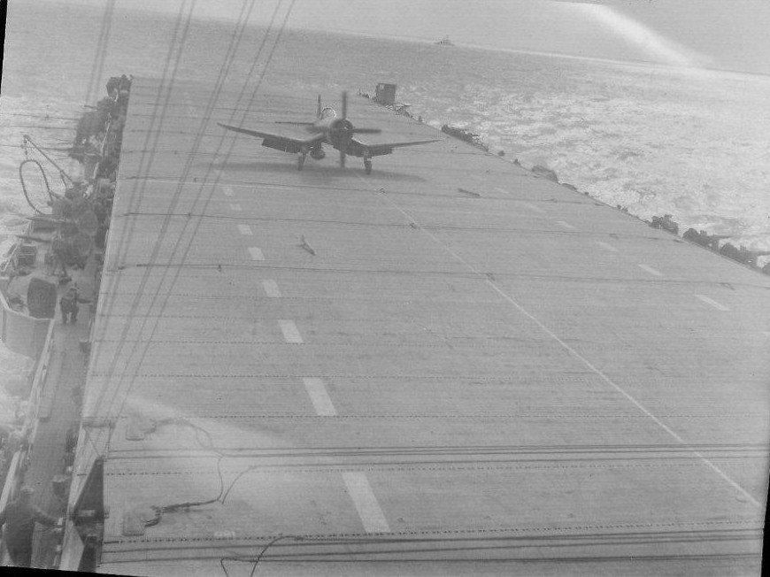 579k | A barrier crash of a U.S. Marine Corps Vought F4U-4 Corsair of Marine Fighter Squadron (VMF) 312 "Checkerboards" (pilot Captain Richard S. Togerson) aboard USS Bairoko (CVE-115) on 11 April 1952. The escort carrier deployed to Korea from 1 December 1951 to 9 June 1952. U.S. Marine Corps photo 127-GR-73-A328142. National Archives and Records Administration, National Archives Identifier (NAID) 74242816. |