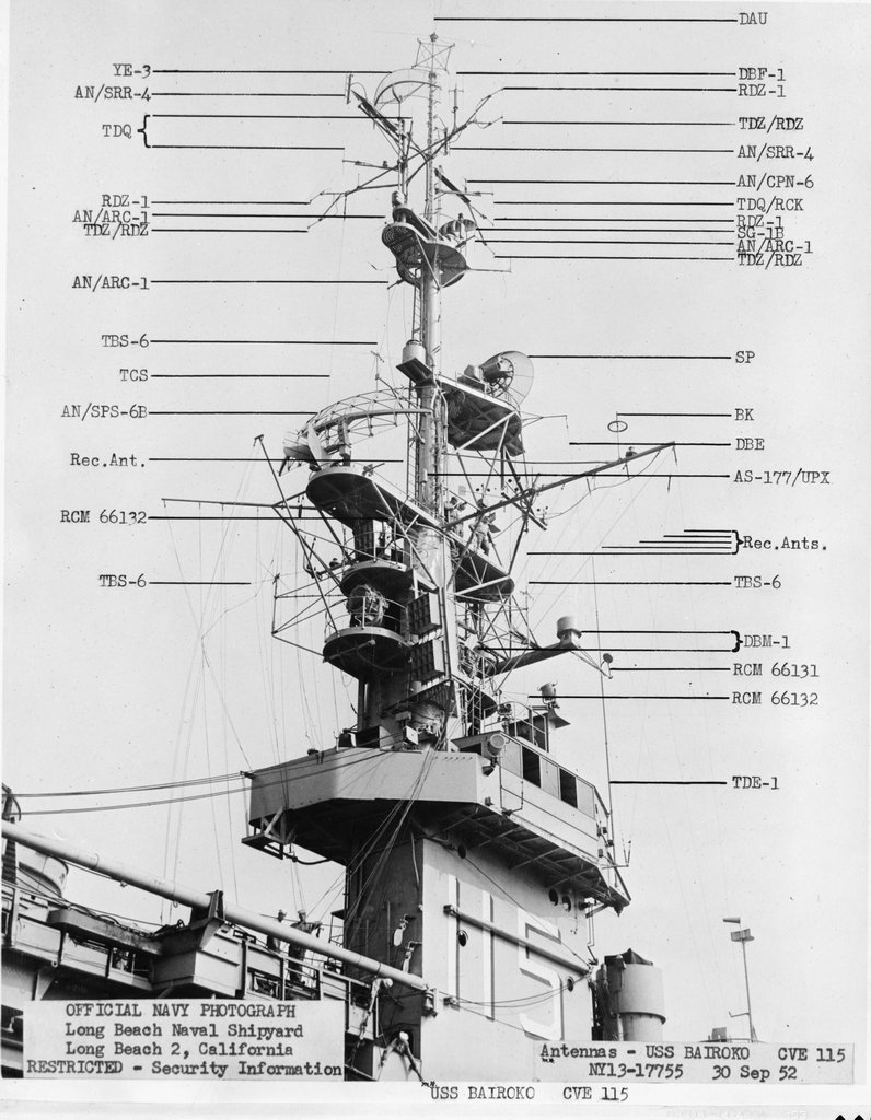 131k | NY13-17753, USS Bairoko (CVE-115), Antennas - 30 September 1952. Long Beach Naval Shipyard, Long Beach 2, California. Official Navy Photograph. National Archives and Records Administration (NARA), photo # rg19nn-b1584-006-042_pr, from Record Group 19. |