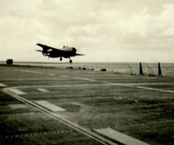 32k | A Ryan FR-1 Fireball of Fighter Squadron (VF) 41 "Firebirds" recovering aboard the escort carrier USS Bairoko (CVE-115) during operations in the Pacific in 1946. Photo courtesy Lawrence B. Massey, SM2C, USN. |