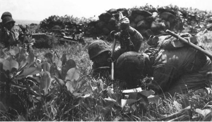 115k | CVE-115 was initially named Portage Bay, for a bay in Alaska. (There are several features on the Alaskan coast known as Portage Bay. In 1944 it probably alluded to the bay on the north coast of Kupreanof Island, Alexander Archipelago, also known as Perenosnaia Bay, Perenosnaya Bukhta, Perenosnaya Creek and Portage Harbor. NS0311519.) Renamed Bairoko, 5 June 1944, after a small harbor on the north coast of New Georgia in the Solomon Islands. In 1942 and 1943, the Japanese used this harbor as the port of supply for Munda airfield, itself important for the battles in and around Guadalcanal. American forces attacked on 20 July 1943, but the Japanese did not abandon Bairoko until 25 August. Its seizure marked an important milestone in the southwestern Pacific counter-offensive (NS0311519a). NS0311519b: A Marine Raiders 60mm mortar crew goes into action on New Georgia. Because the Raiders had no heavier weapons, their initial efforts at Bairoko were mostly unsuccessful. (Maps NS0311519 and NS0311519a courtesy of Google Maps. Photo NS0311519b Department of Defense Photo (USMC) 54650.) |