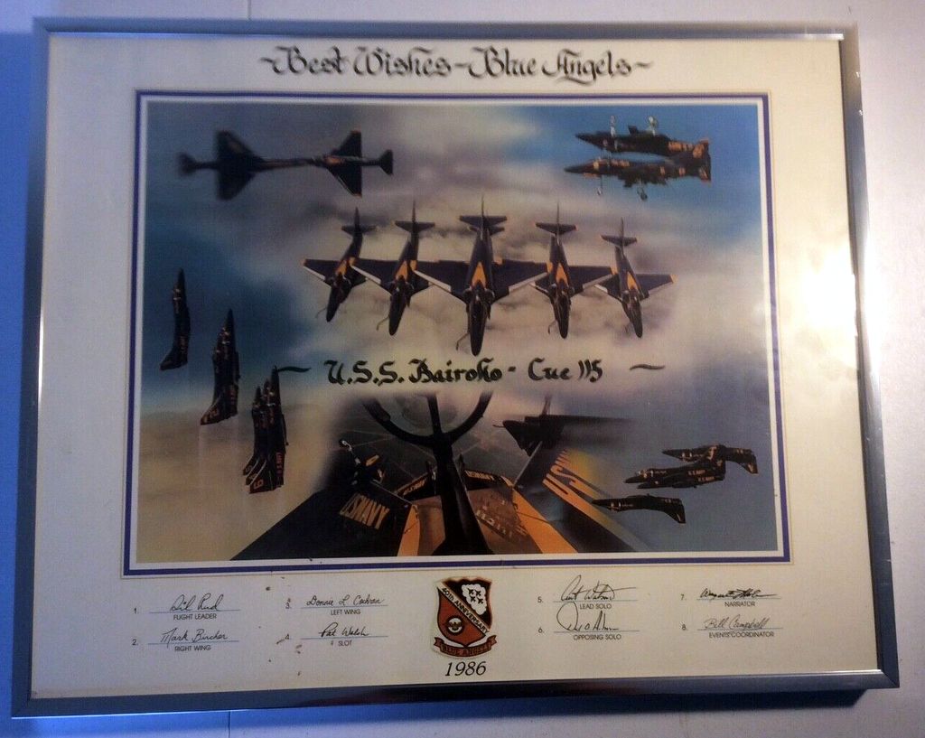 117k | "Best Wishes—Blue Angels, USS Bairoko CVE-115, 1986" "Blue Angels" 40th Anniversary. Signed by: #1, CDR Gil Rud, Flight Leader, A-4F Skyhawk BuNo 155033; #2, Capt. Mark Bircher, USMC, Right Wing, BuNo 154172; #3, LCDR Donnie L. Cochran (first African-American "Blue Angel" pilot), Left Wing, 154983; #4, LT Pat Walsh, Slot Pilot, 154180; #5, LCDR Curt Watson, Lead Solo, 154211; #6, LT David Anderson, Opposing Solo, 154904; #7, LT Wayne Molnar, Narrator, 158722; #8, Maj. Bill Campbell, USMC, Event Coordinator, TA-4J BuNo 158722. |