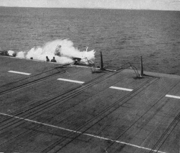 187k | A Ryan FR-1 Fireball from Fighting Squadron (VF) 41 "Firebirds" recovering aboard the escort carrier USS Bairoko (CVE-115), just before the nose gear collapsed, 13 March 1946. National Museum of Naval Aviation photo, # 1996.253.7133.006. |