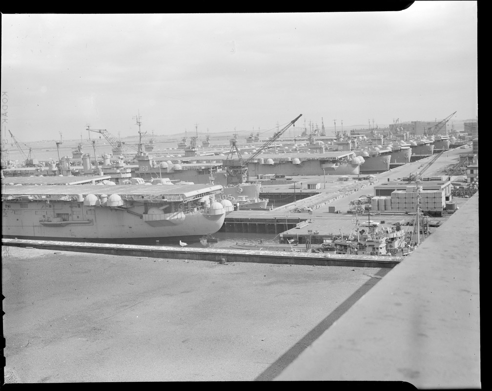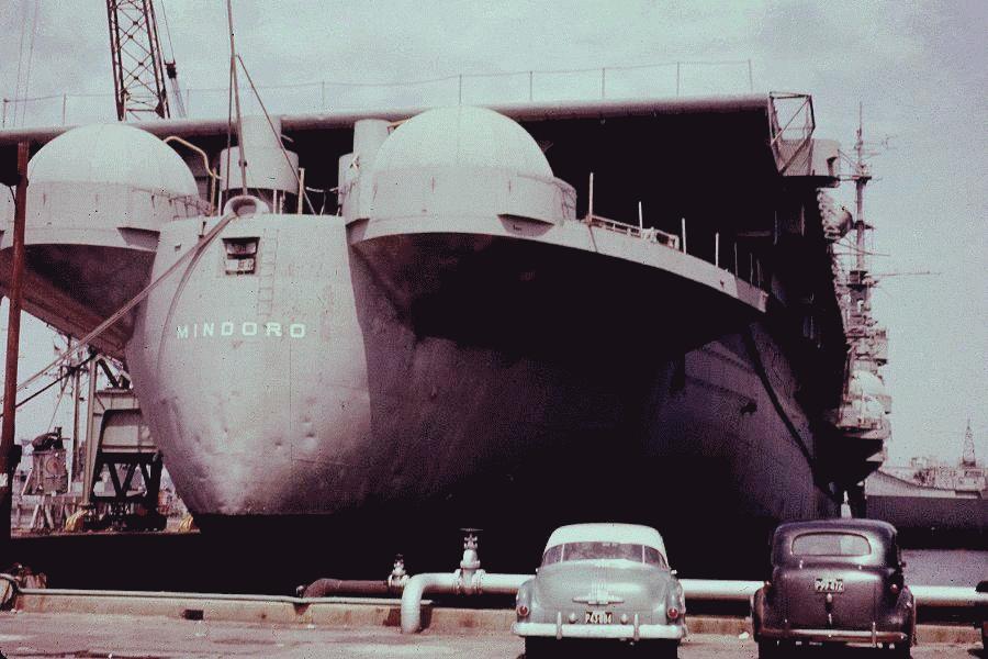 195k | "Uncle Sam's aeroplane carrier tied up at South Boston Navy Yard—from Commonwealth Ice & Cold Storage building." October 1956. Mindoro's island, with her hull number ("120") can be easily seen in the center-left, middle distance. Other ships that can be identified in the original photo are the light cruiser ex-Dayton (CL-105) and many escort carriers, among them ex-Hoggatt Bay (CVE-75), ex-Rudyerd Bay (CVE-81), ex-White Plains (CVE-66), and ex-Nehenta Bay (CVE-74). |