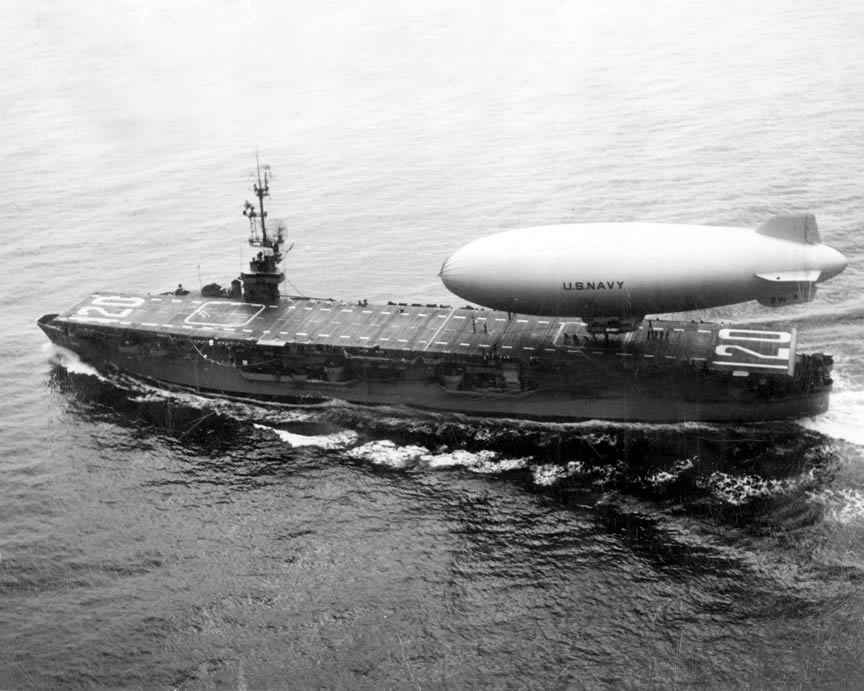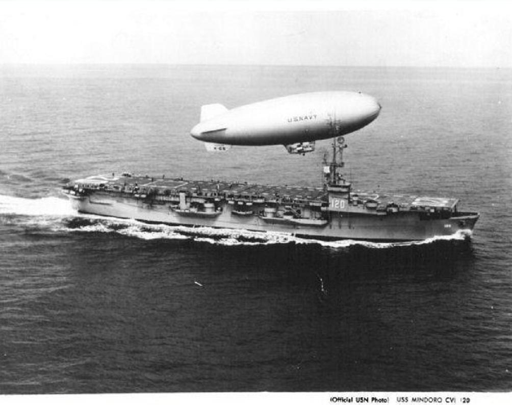 89k | USS Mindoro (CVE-120) underway, 28 April 1950, as blimp K-69 leaves her. K-69 was a non-rigid patrol airship used in ASW operations (USN photo). | Robert Hurst Tommy Trampp |