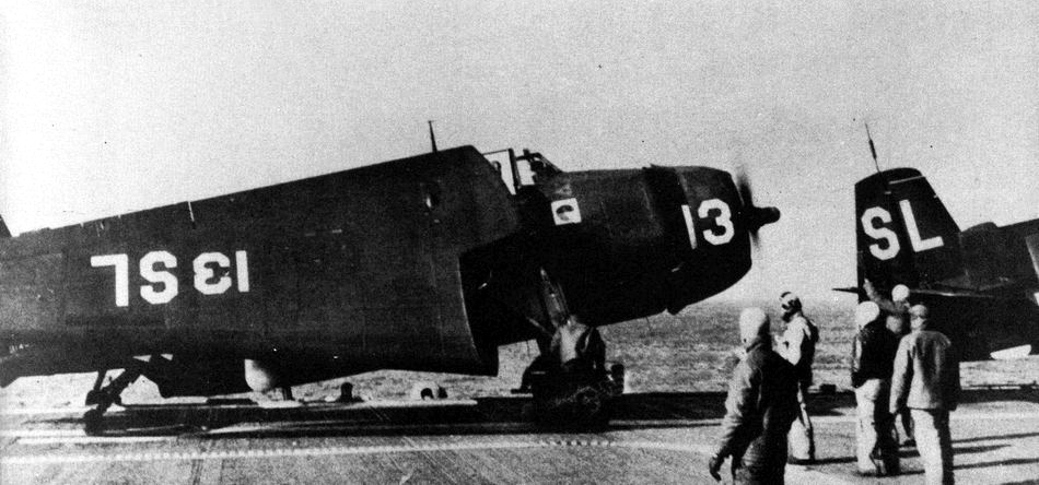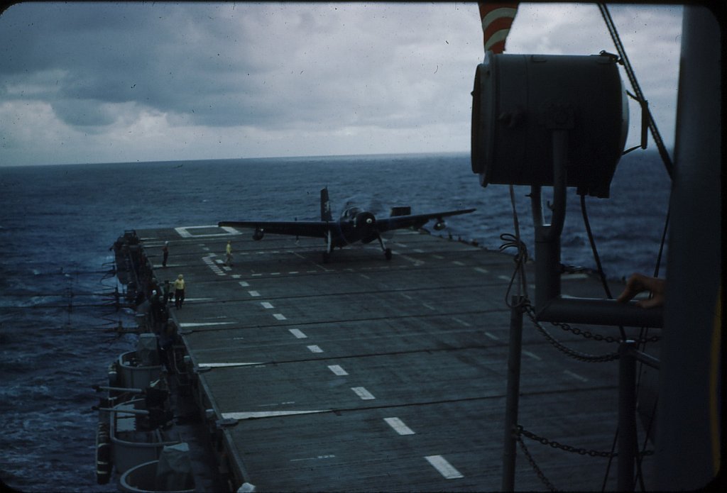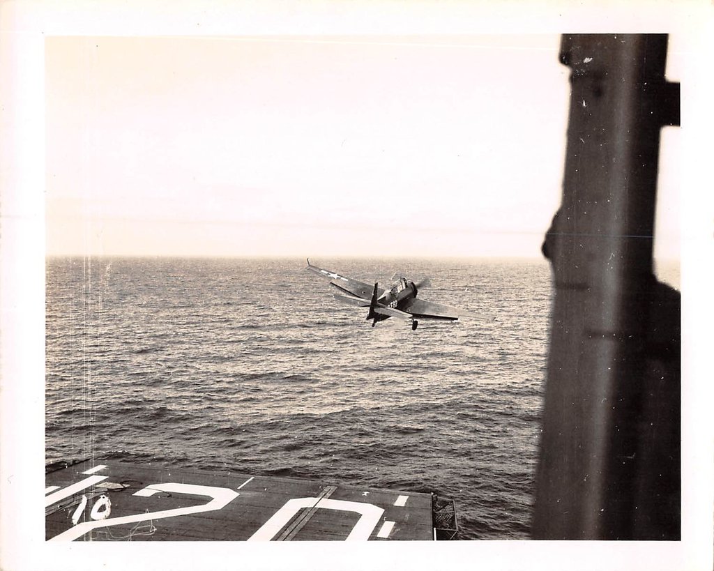 120k | Flight deck activity aboard USS Mindoro (CVE-120), circa 1946. Avenger, side number F82, launching. A damaged Corsair, side number B117. From the collection of Gerard Nicolais, Charlie's father-in-law. |