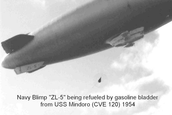 31k | Navy blimp ZL-5 approaches USS Mindoro (CVE-120) for refueling via gasoline bladder, 1954. |