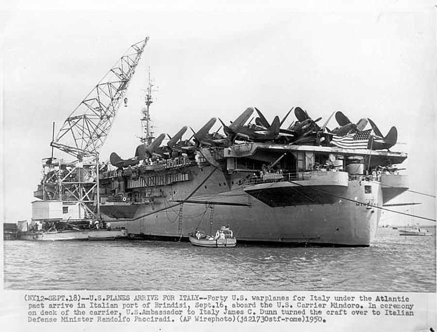 93k | September 18, 1950—U.S. PLANES ARRIVE FOR ITALY—Forty U.S. warplanes for Italy under the Atlantic pact arrive in Italian port of Brindisi, Sept. 16, aboard the U.S. carrier Mindoro. In ceremony on deck of the carrier, U.S. Ambassador to Italy James C. Dunn turned the craft over to Italian Defense Minister Randolfo Pacciradi. (AP Wirephoto)(jd21730stf-rome.) |