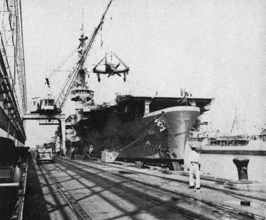 148k | USS Mindoro (CVE-120) loading Curtiss SB2C-5 Helldivers for delivery to Italy at Naval Station Norfolk, Virginia, in September 1950. Mindoro transported 42 Helldivers and a number of North American F-51D Mustangs to Brindisi, Italy. U.S. Navy photo from the Mindoro 1950 Cruise Book. |