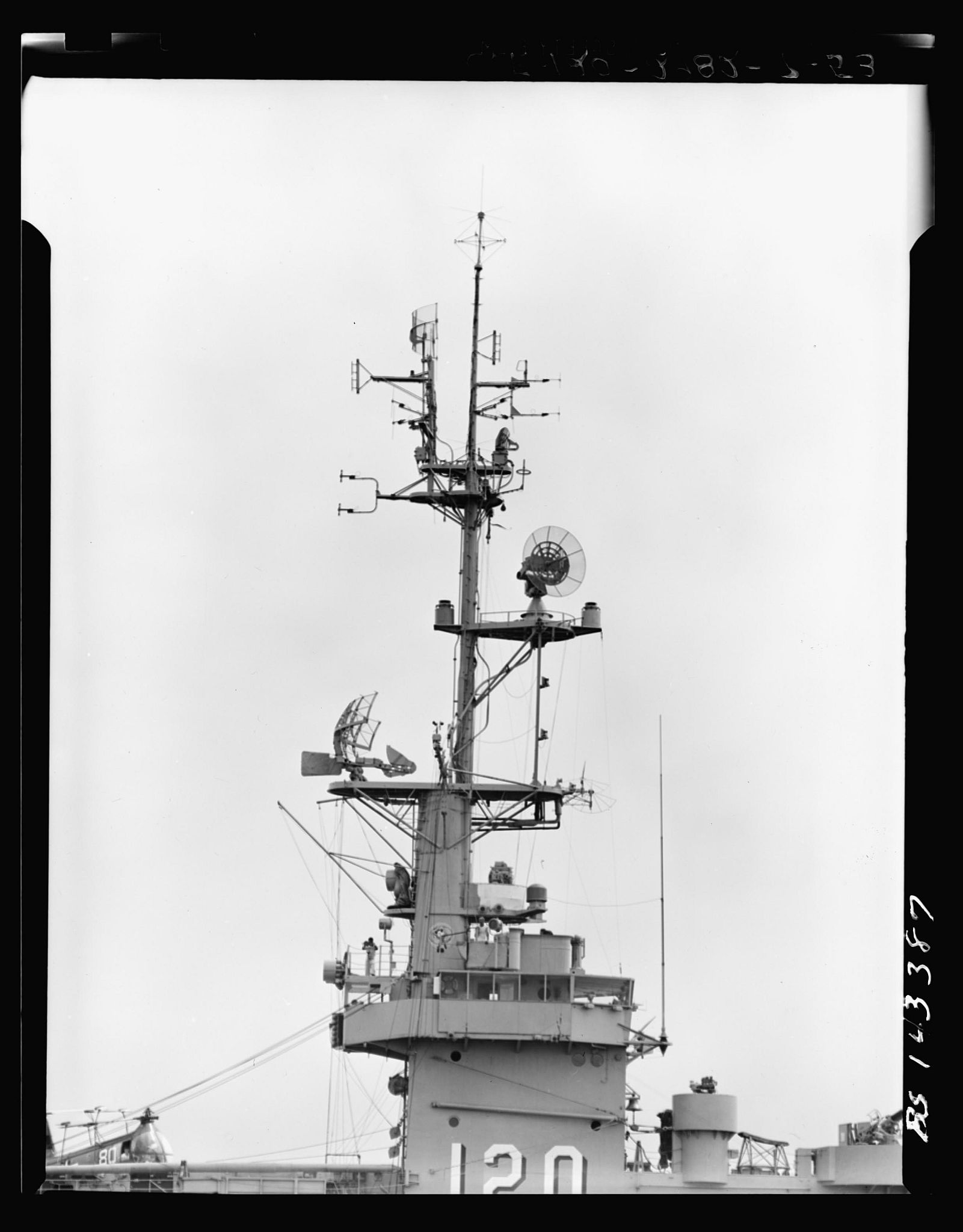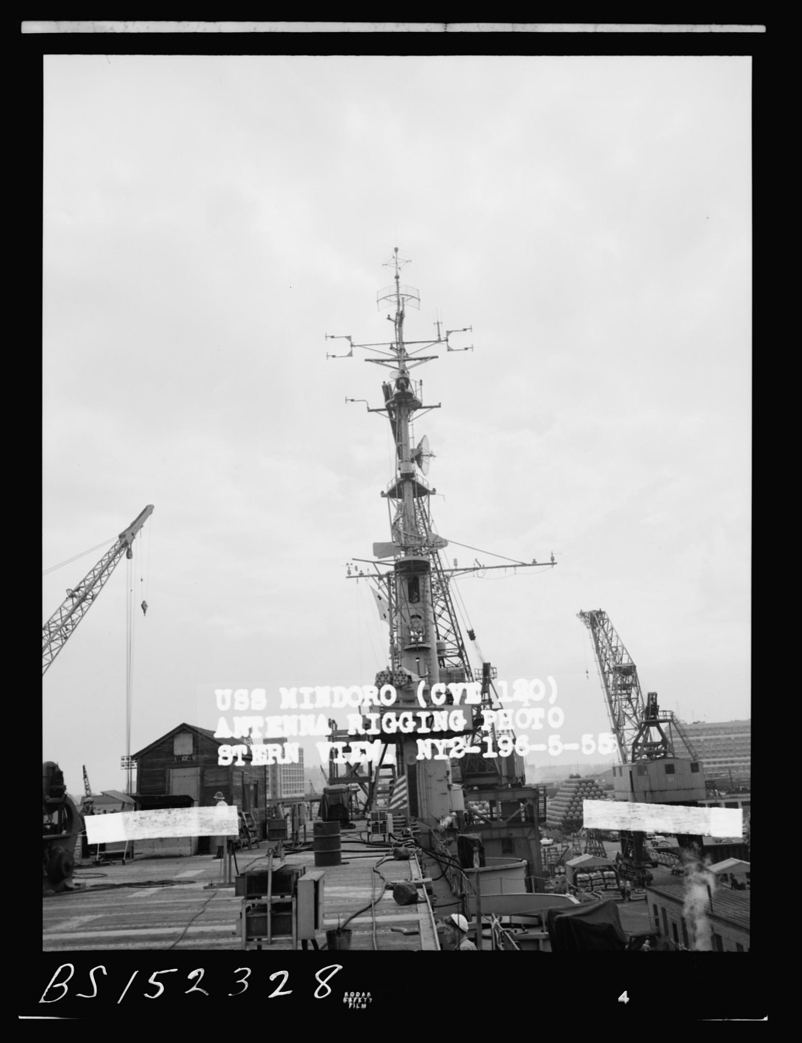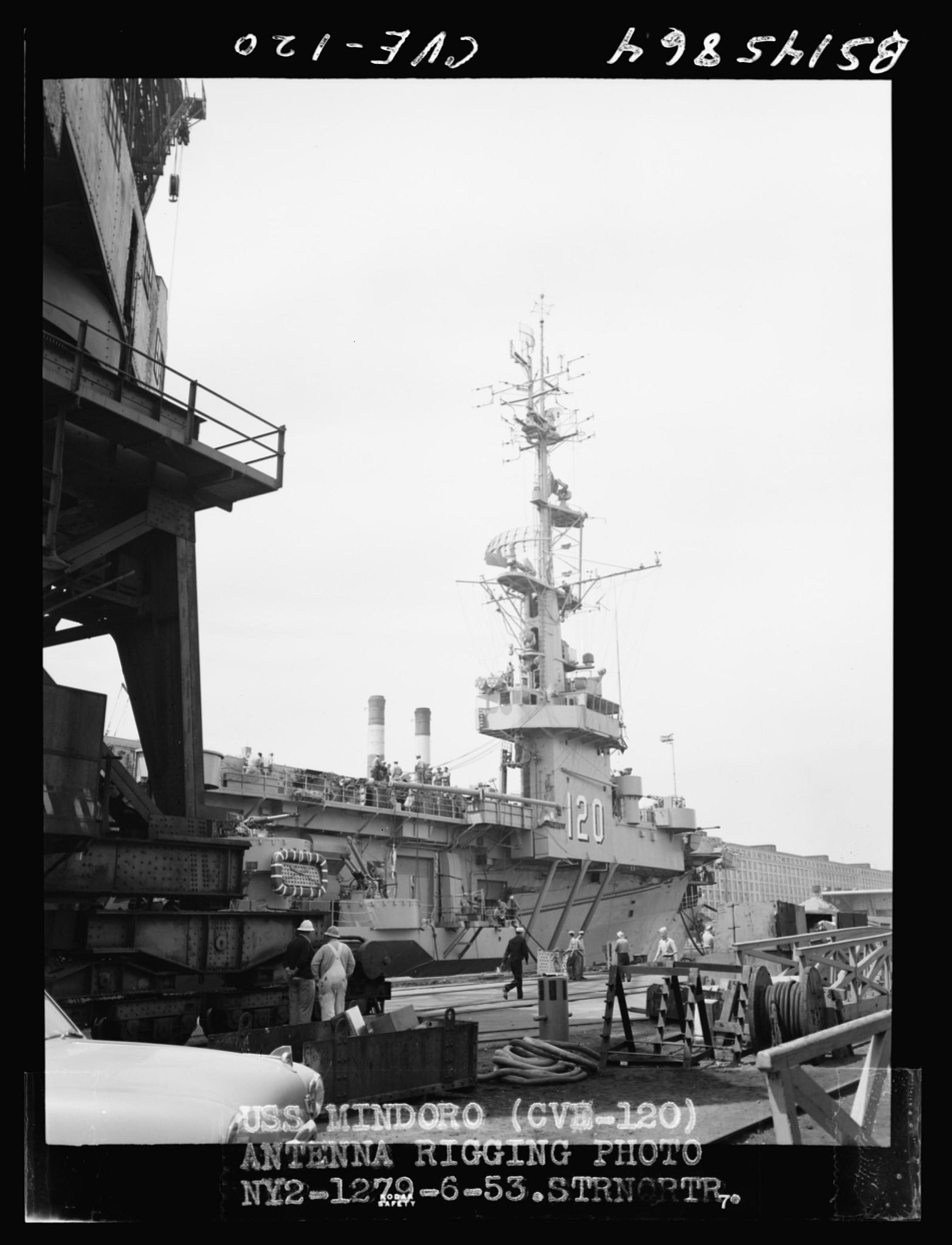 141k | USS Mindoro (CVE-120), Boston Naval Shipyard, June 1953. Antenna rigging photo NY2-1276-6-53, bow quarter port. National Archives and Records Administration (NARA) photo. National Archives Identifier 24741459. Local Identifier 19-NN - CVE-120 Mindoro - 145862. |